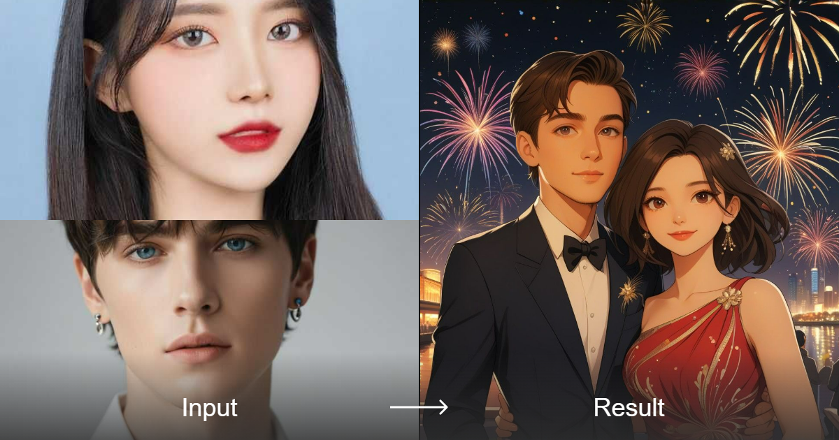 Generate modern city background, a man and a woman welcome the new year with Fireworks Night style converter. It is a cartoon style, perfect for featured, group photo, animation, digital painting, and spring festival.