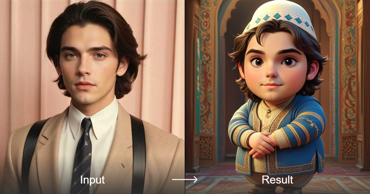 A 3D Cute Style converter for generating Muslim-themed images of cute male dolls.