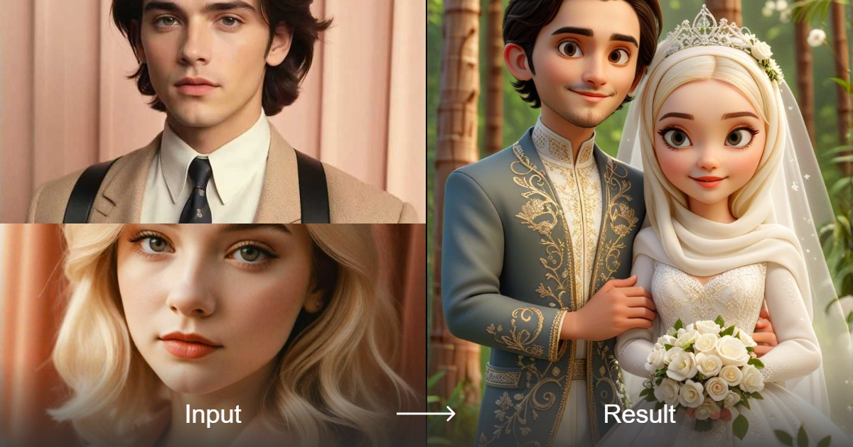 Generate cute and 3D group photos with A1 Art's Cartoon Muslim Wedding style converter.