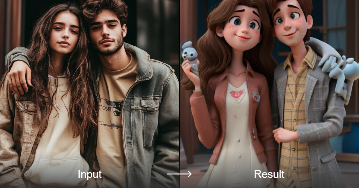 Generate cute and 3D images of two Disney couple with our style converter. Perfect for adding a touch of magic to your projects.