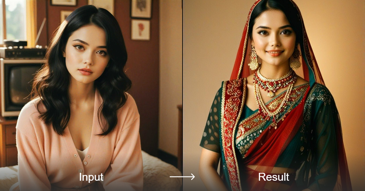 The Elegant Indian Woman Style Converter is an AI image generator that creates high-quality images of updo Indian women in traditional red Indian dresses and veils. The images are professionally taken, with a blank background to highlight the subject. The output format includes both photography and portraiture styles.