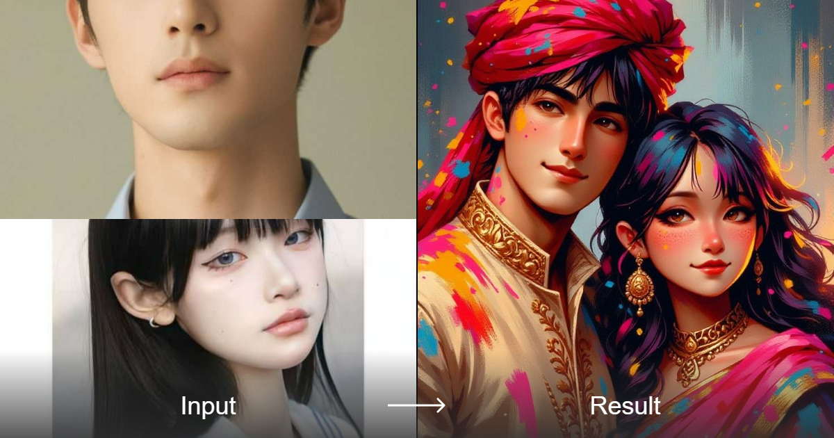 Create a vibrant, animated, and artistic digital painting of your favorite couple from your Holi festival, featuring fantastical elements and rich, illustrative colors.