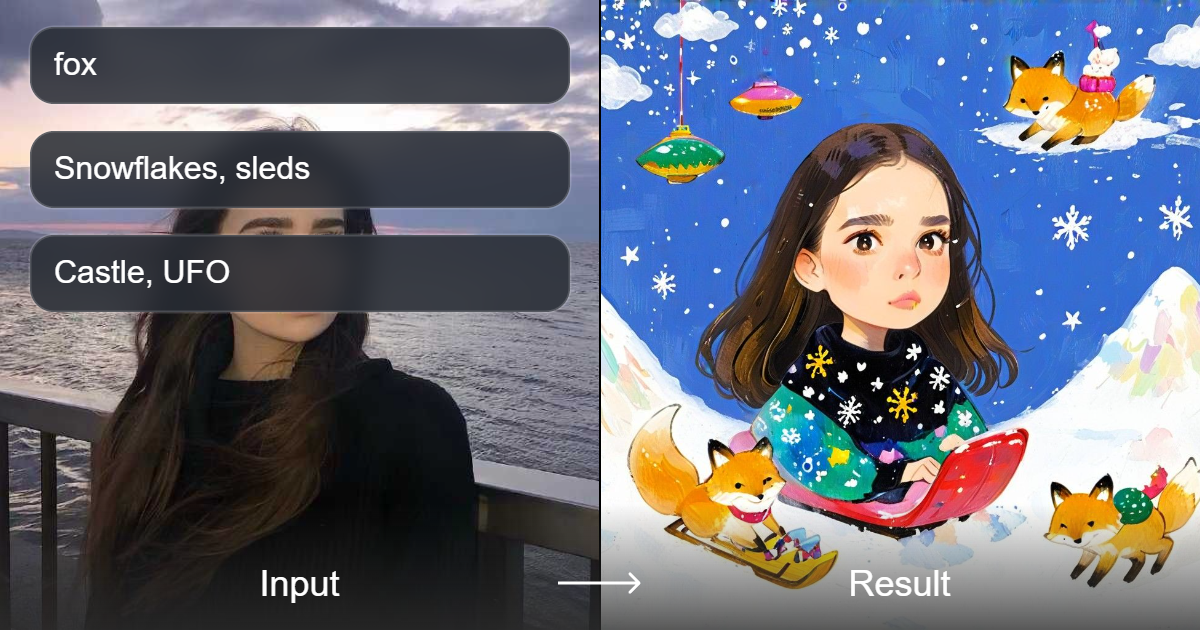 Hasilkan lukisan yang menggemaskan, ilustrasi yang lucu, dan potret kepala dengan pengubah gaya ini, sempurna untuk mencipta seni bertemakan musim sejuk yang mempesona.