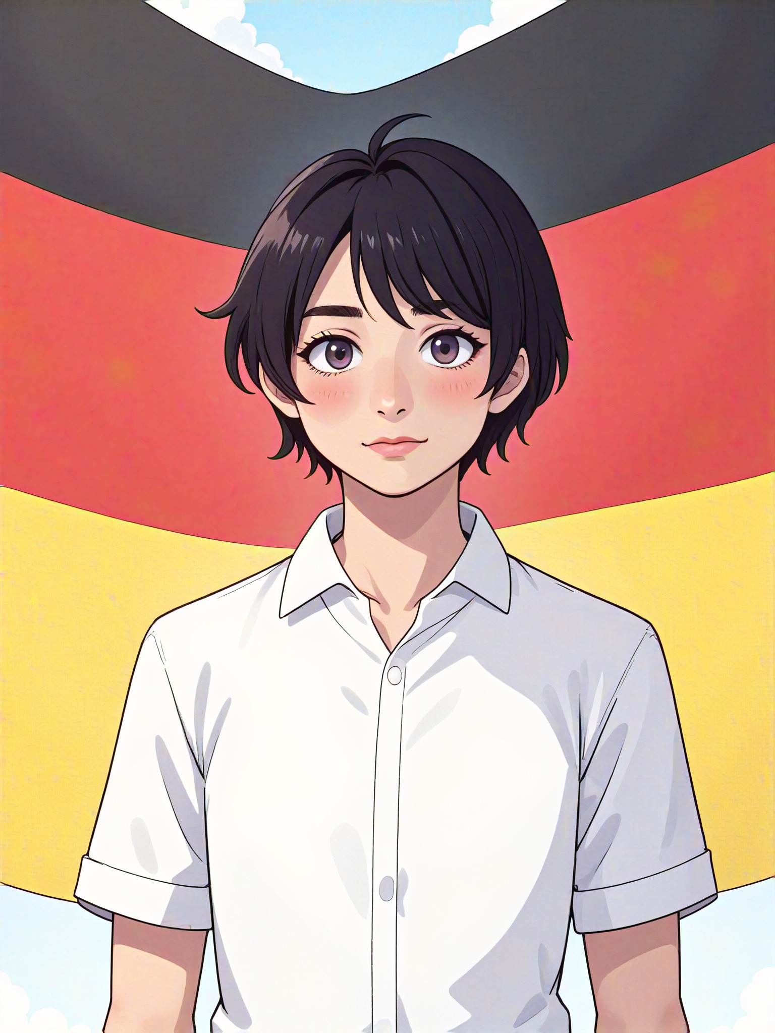 Penukar gaya ini menambahkan bendera Jerman Barat yang besar kepada mana-mana gambar, menukarkannya menjadi ilustrasi, lukisan digital, animasi, atau CG 2.0. Format output termasuk seorang yang memakai baju putih dan bendera besar di latar belakang.