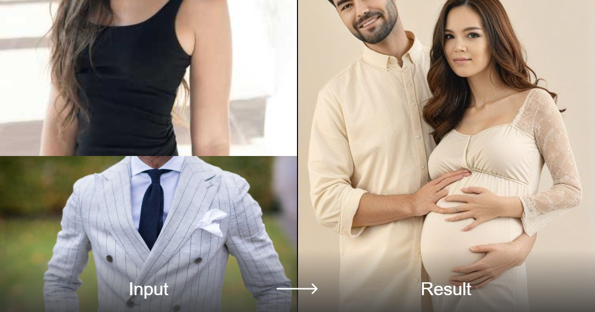 A professional photo style converter that creates portrait-style images of couples, featuring a pregnant woman in delicate and professional photography. The style includes a group photo and a realistic depiction.