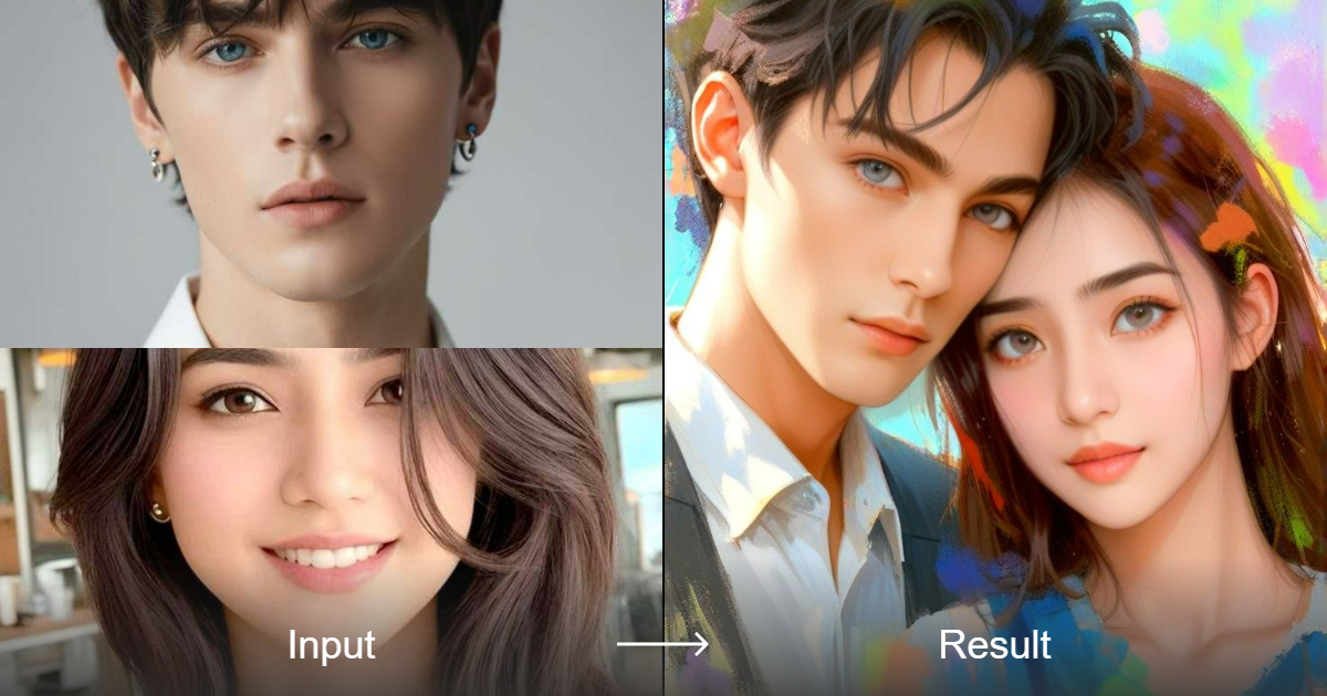 Generate digital painting, group photo, animation, fantasy, male, female, cartoon, sci-fi, base model, 2.5d, and realistic images with the Pastel Couple Photo style converter. Compose your perfect couple photo with a unique twist.