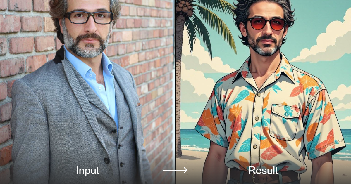 Easily change your formal look to a lively beach casual style with a1.art's converter. Enjoy a fresh style transformation in seconds.