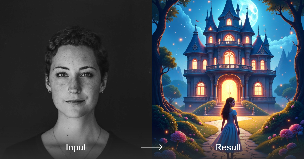 Transform your photos into enchanting fantasy illustrations featuring a glowing magical mansion, floating lights, and enchanted gardens, all in photorealistic detail.