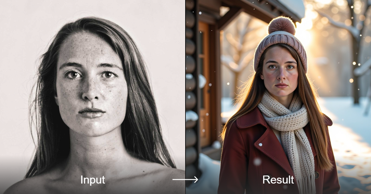 Transform your photos into serene winter scenes with a cozy snow cabin, featuring realistic details, falling snowflakes, and dreamy lighting.