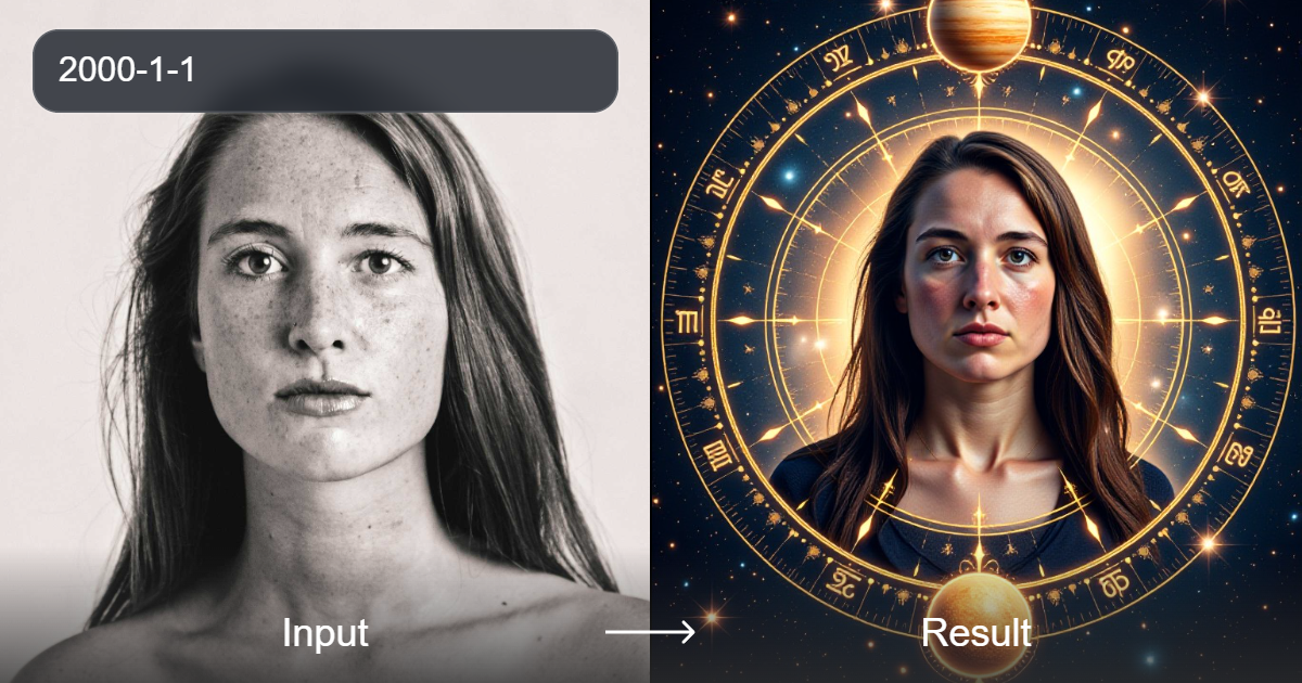 Generate a mystical astrological natal chart that incorporates your portrait, featuring glowing planetary symbols, a starry background, and a cosmic aura, all rendered in photorealistic detail.