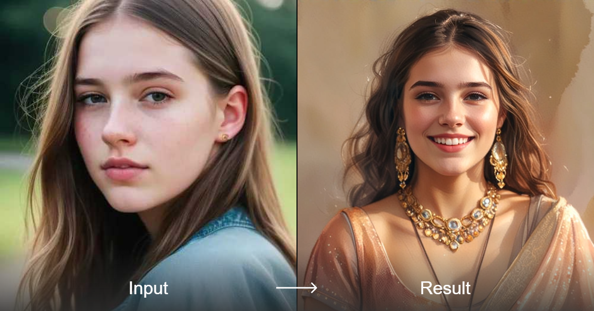 Elevate your digital artwork with A1.Art's "Cute Smile" style converter, offering art styles, paintings, portraits, watercolors, sketches, and digital paintings. Transform your images into charming portraits with golden chains in neck.