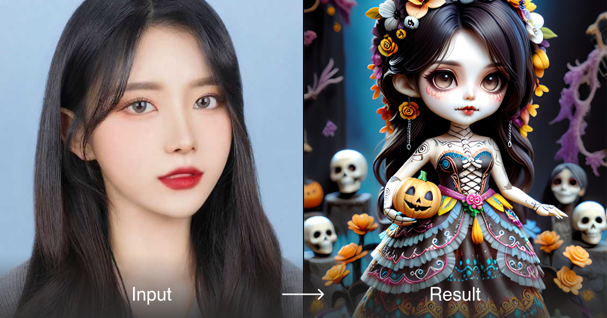 Chibi_Halloween woman dressed in sugar skull costume flowers for Hallowe'en, an amazing octane render of the Chibi_Halloween,