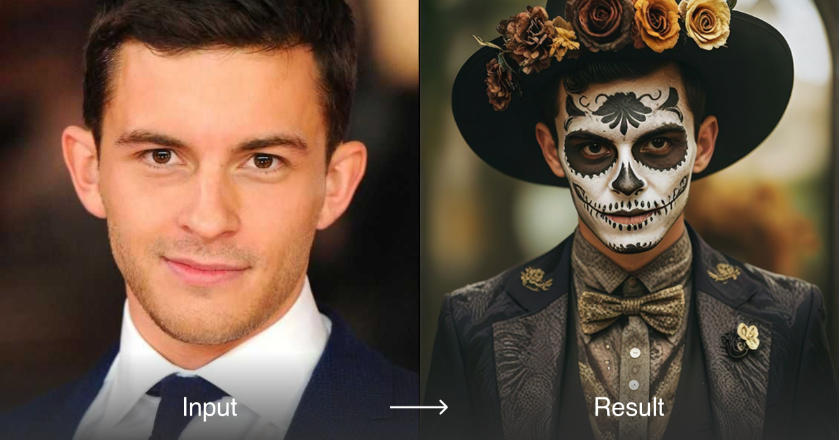 Photographed in A1.artClose shot of a male colombian model, upper body, Day of the Dead celebration with( sugar skull makeup), wearing hat, Fujifilm XT3, Canon R5, Fujicolor Fujichrome Velvia 100