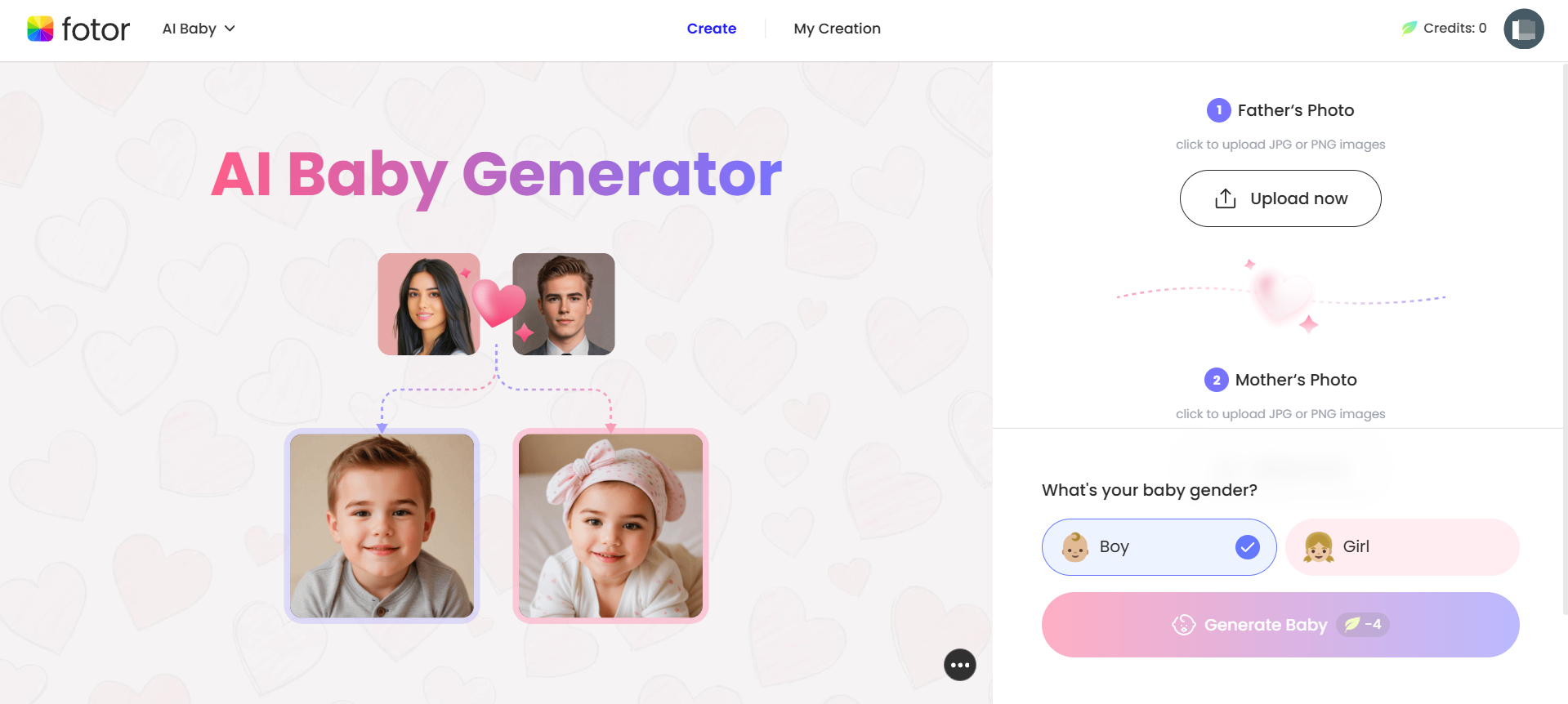 - Interface intuitiva: Fotor 's IA bebê gerador fornece uma interface simples e intuitiva para seus usuários. Como mostra a imagem acima, você é capaz de ver fotos de você, seu parceiro, e seu futuro adorável em uma página web.