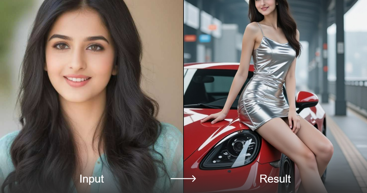 Create a modern, fashionable, and sexy sports car model with a sleek design, wearing a short skirt and interacting with a red supercar. High-resolution images with shallow depth of field highlight the subject and car.