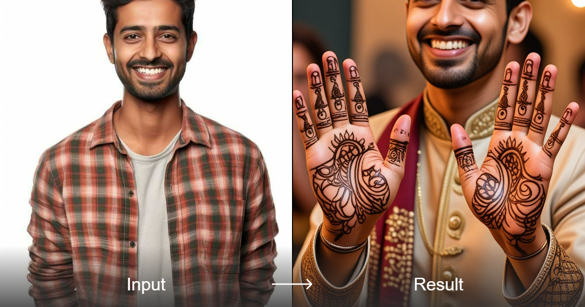 Transform your wedding photos into breathtakingly realistic and artistic renditions with our unique style converter, featuring intricate mehandi designs.