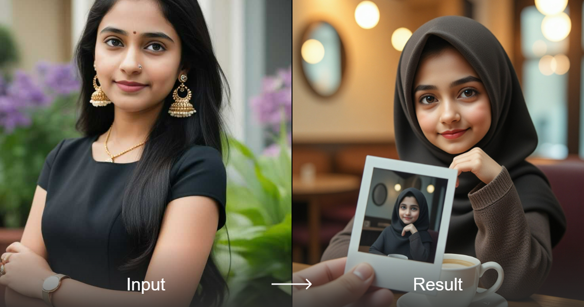 Create a Q version 3D doll, upper boy, wearing hijab, smiling in a retro cafe setting, with a hand holding a Polaroid photo, seamlessly blending into the real world.