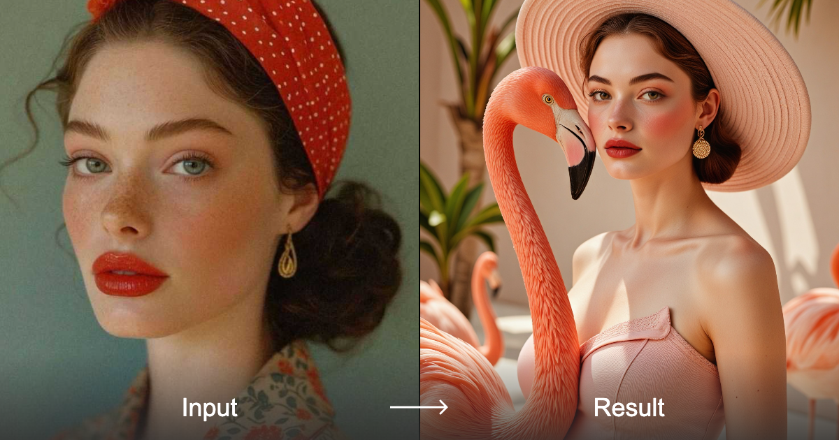 Transform your photos into stunning high-fashion portraits inspired by flamingos, featuring elegant clothing, vibrant pink tones, and a dreamy tropical setting.