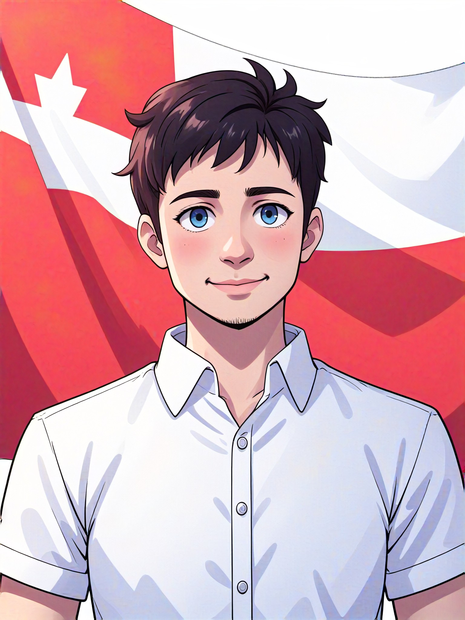 Человек в белой рубашке, за которым развевается огромный флаг Чехии, изображен в различных форматах, таких как иллюстрация, цифровая живопись, анимация и CG 2.0. Основной акцент на CG 1.0.