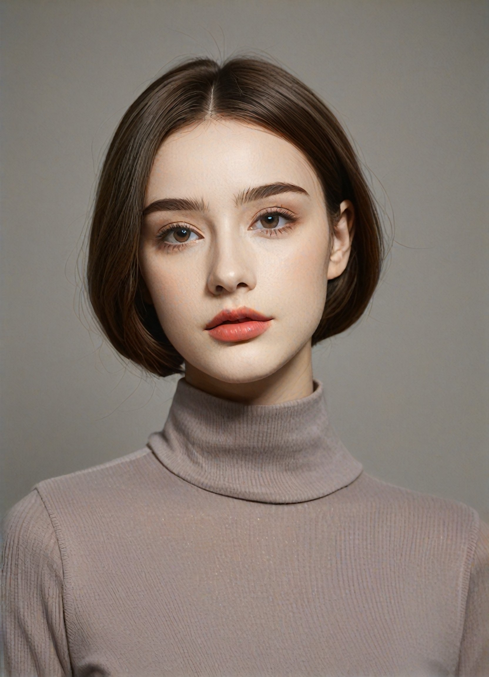 Create realistic, portrait photography of one person with dark grey hair. Wear a top that matches the hair style and color. Try on different hairstyles and see which look best with a1.art.