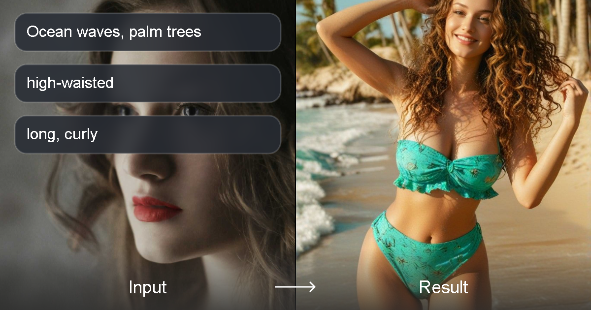 A professional photo and portrait style converter that generates high-quality images with a tropical paradise vibe, featuring two bikini-clad beauties, sunlit glow, ocean breeze, turquoise waves, and a flawless complexion.