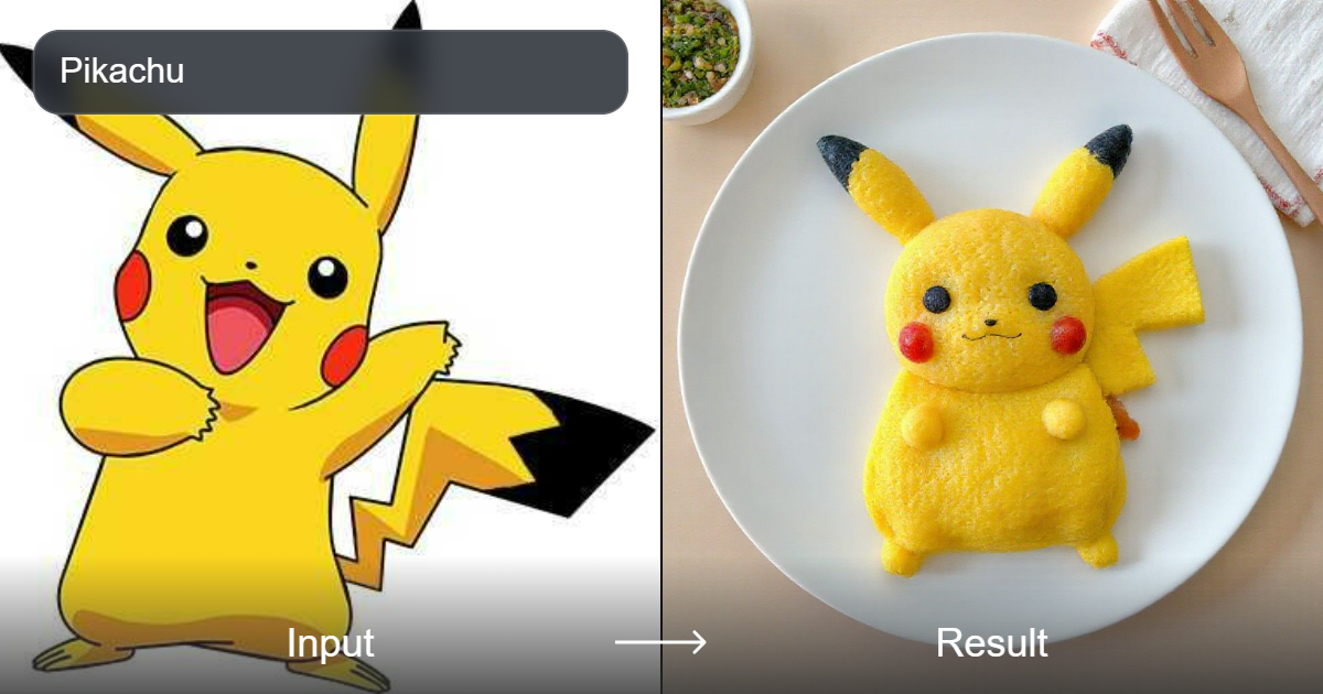 A Material, Master, Realism, Generator style converter for creating adorable food images. Output format examples included.