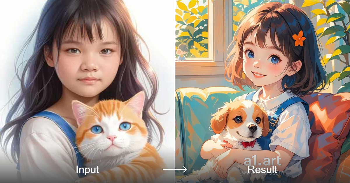 The girl holding the dog style converter generates beautiful paintings and illustrations in the style of the image. Perfect for adding a touch of charm to any project.