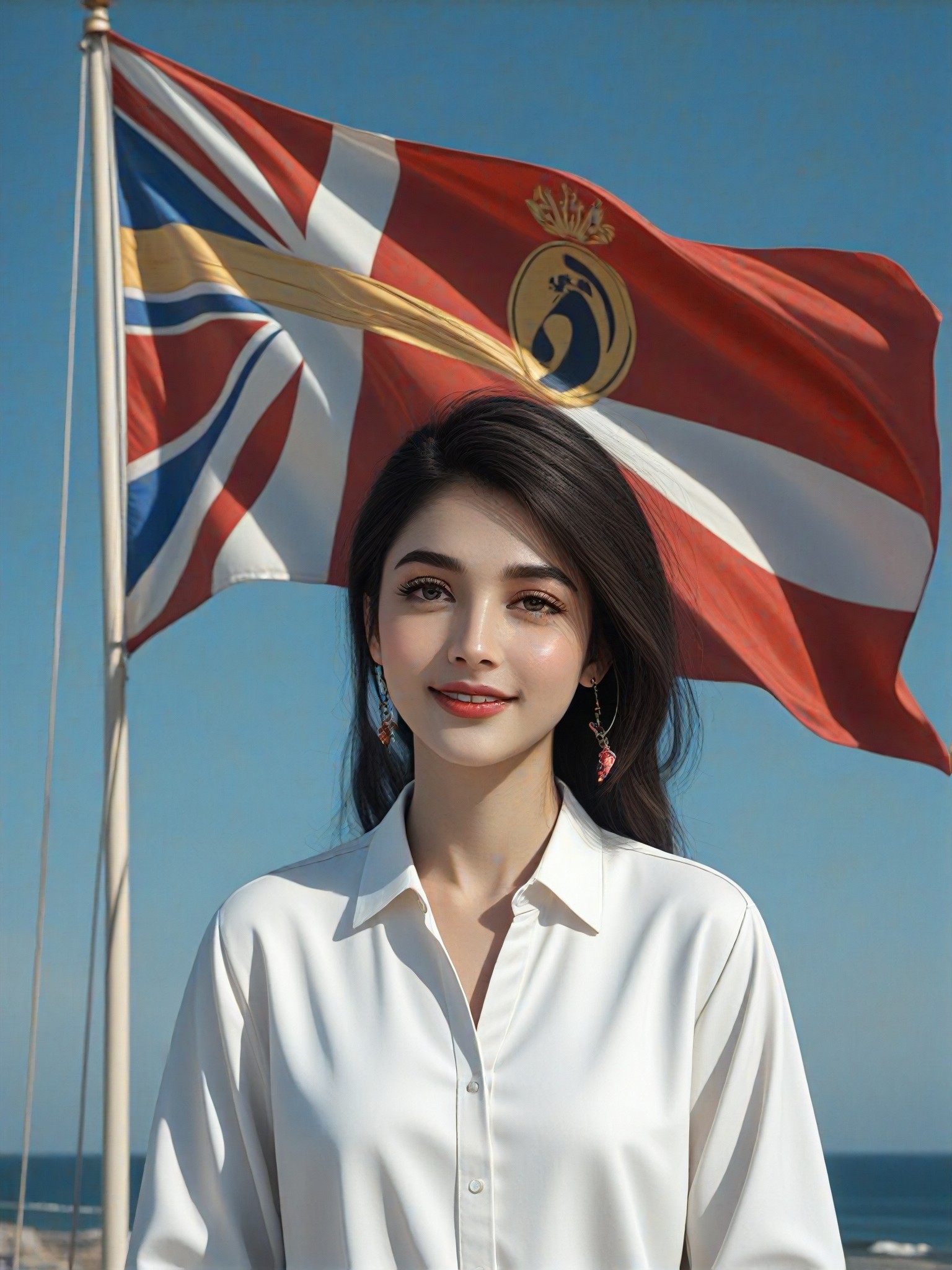 A person, upper body, wearing a white shirt, standing and smiling, with a huge Saint Kitts and Nevis flag flying behind them.