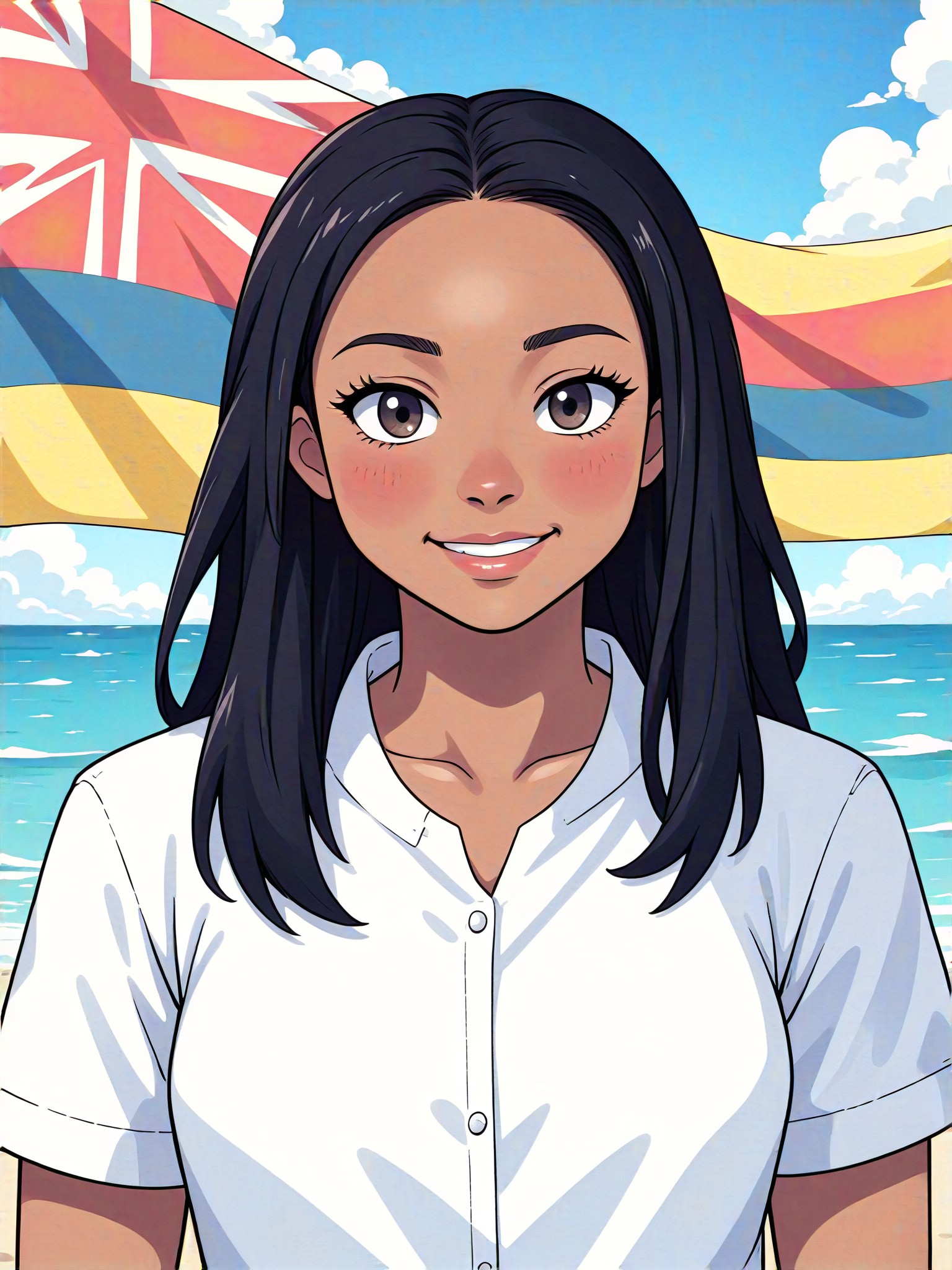 Create a unique and eye-catching image by adding a huge Hawaiian flag behind a person standing and smiling.
