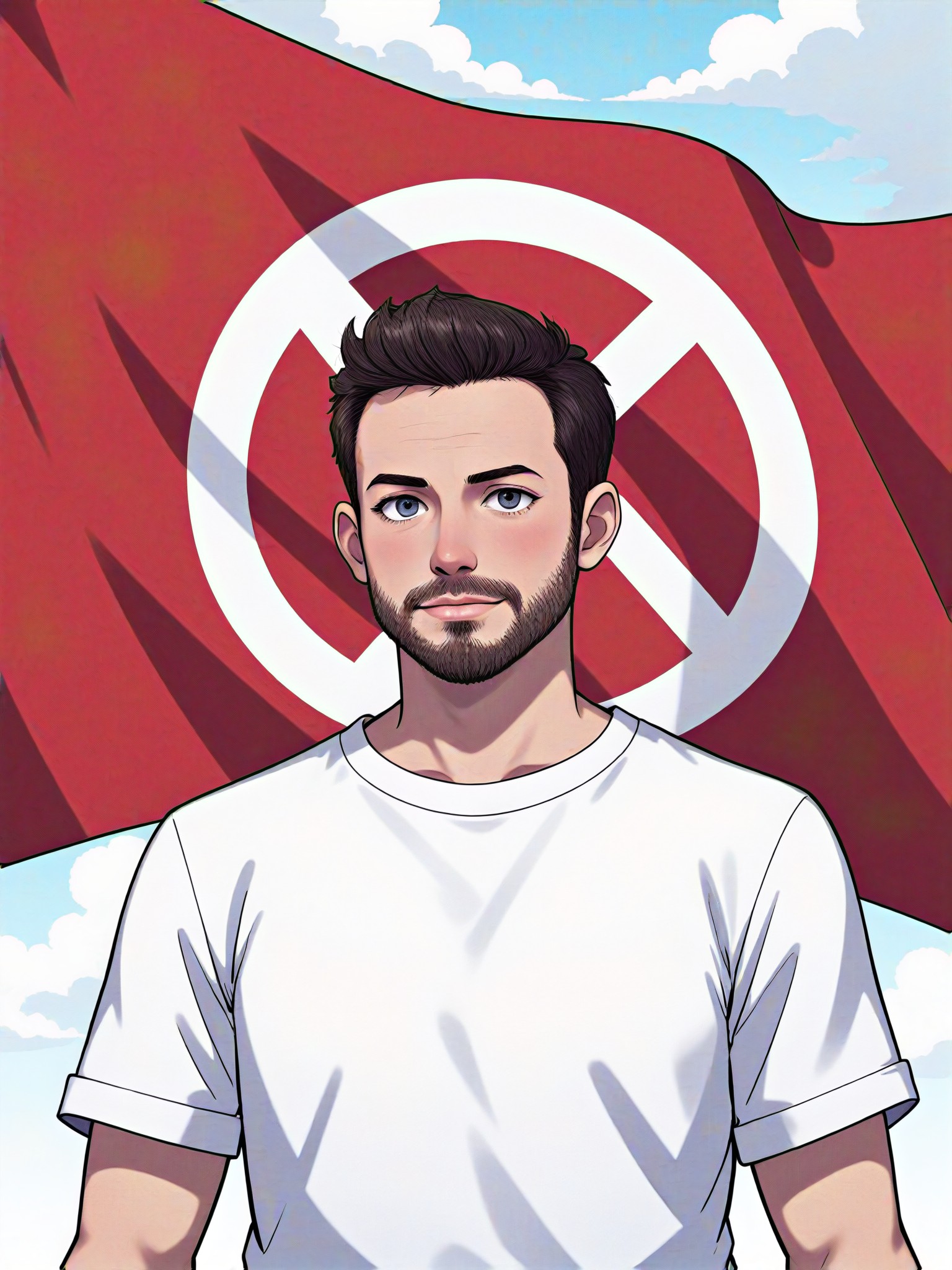 A person wearing a white shirt, standing and smiling, with a huge anarchist flag flying behind them.