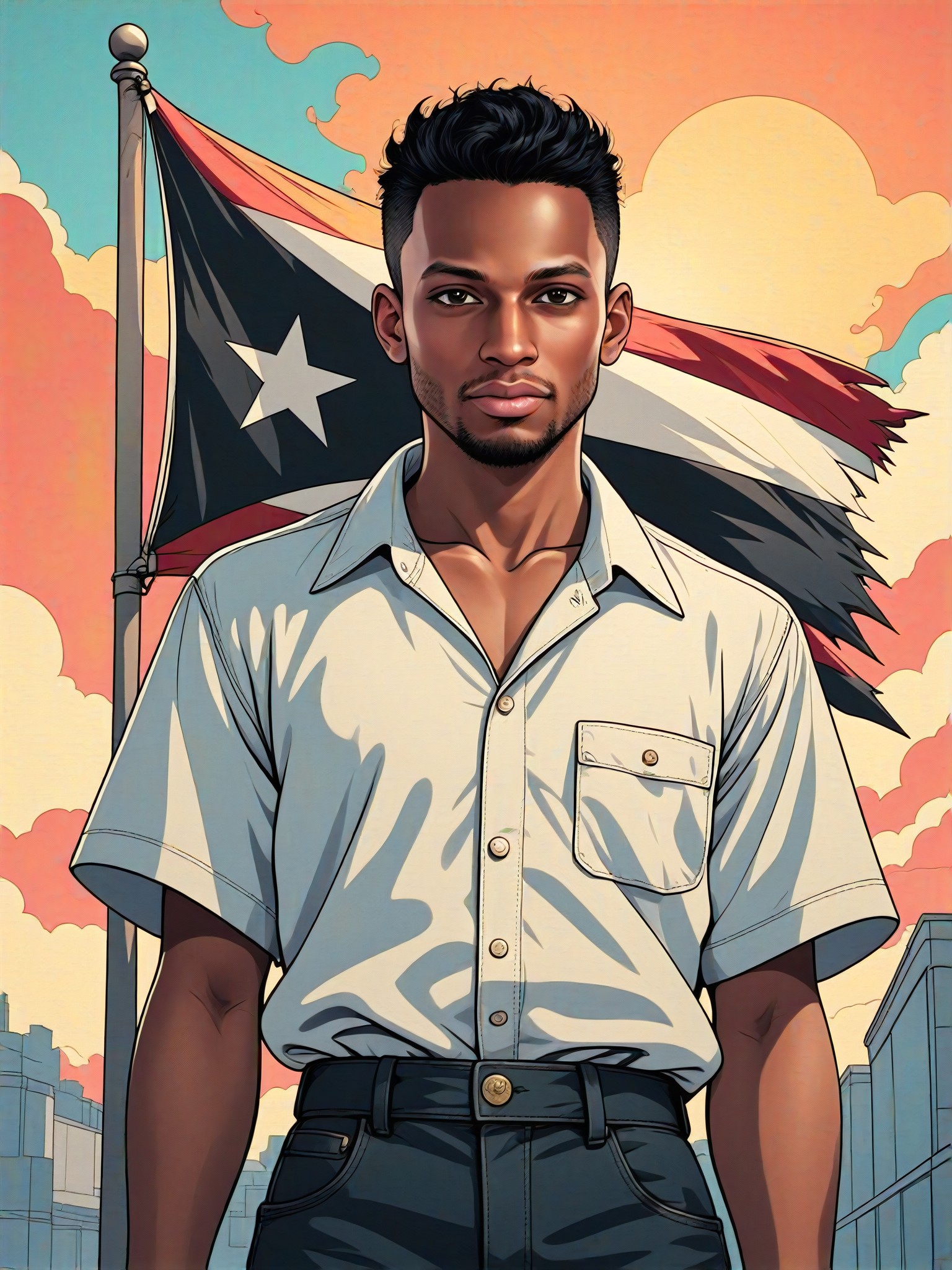 A digital painting and illustration style converter that adds a huge black Puerto Rican flag behind a person standing and smiling, with options for featured, CG 2.0, animation, master, and CG 1.0.