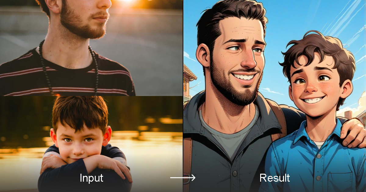 A unique AI image generator that creates American comic style father and son photos with detailed character design, bright colors, and dynamic background. Illustration, digital painting, and group photo formats available.