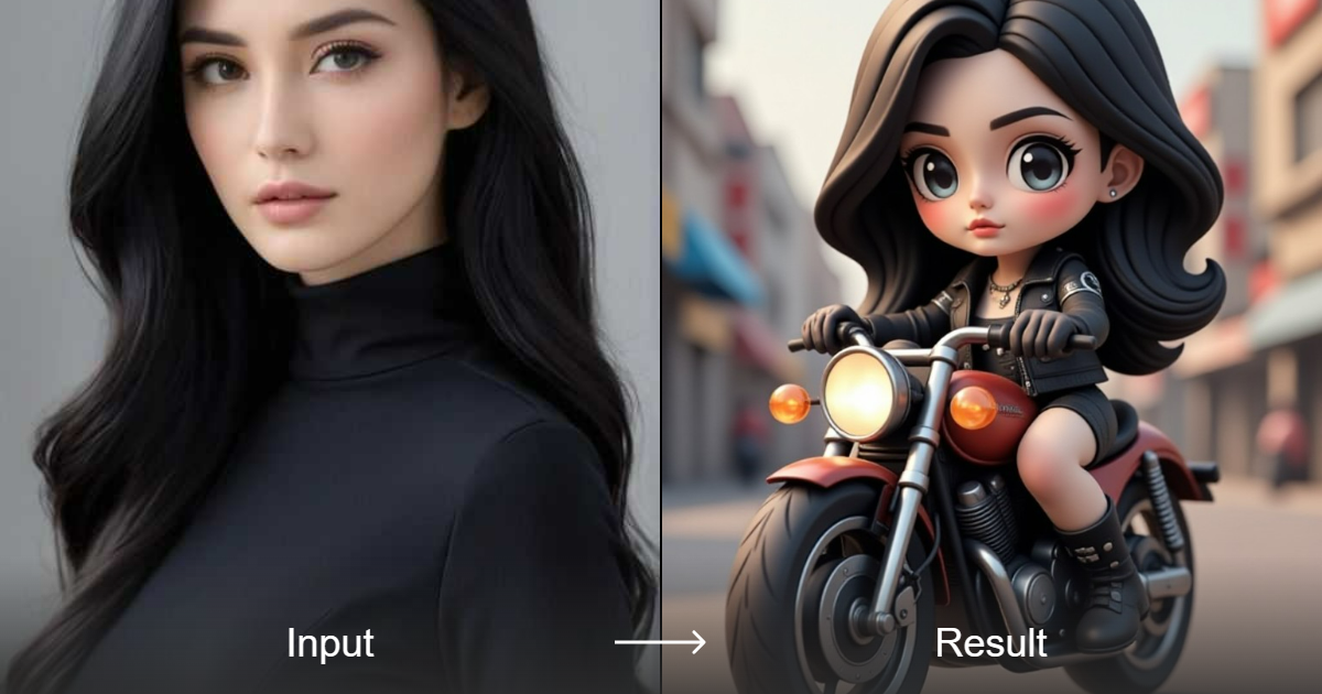 Transform your photos into 3D, Q-version motorcycle riders wearing punk attire in Indian city streets using A1.Art's Motorcycle Player style converter.
