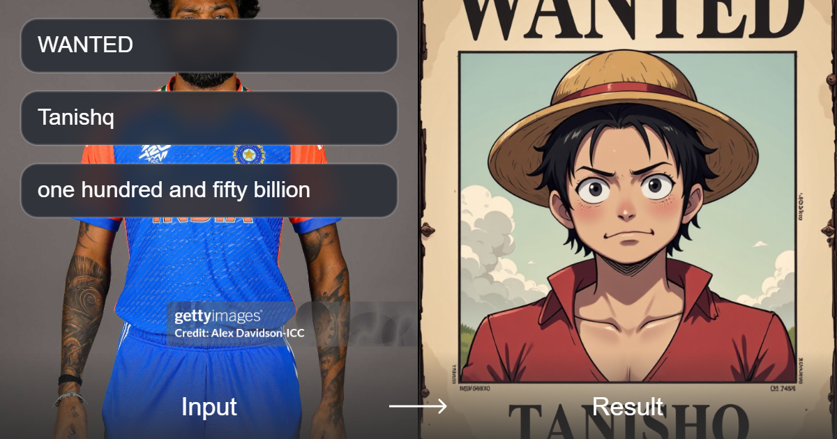 สร้างโปสเตอร์ผู้ร้ายที่น่าทึ่งในธีมวันพีซด้วยศิลปะแฟนตาซีการ์ตูนสีสันสดใส พร้อมแสดงภาพ มังกี้ ดี ลูฟฟี่ และปรับแต่งรายละเอียดได้