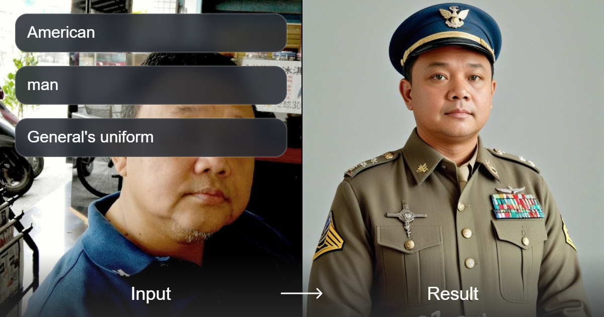 Stil dönüştürücümüz, farklı ülkelerden gerçekçi ve profesyonel askeri üniforma resimleri oluşturur. Kimlik fotoğraflarından etkileyici portrelerine kadar, resimlerimiz her türlü amaç için uygundur.