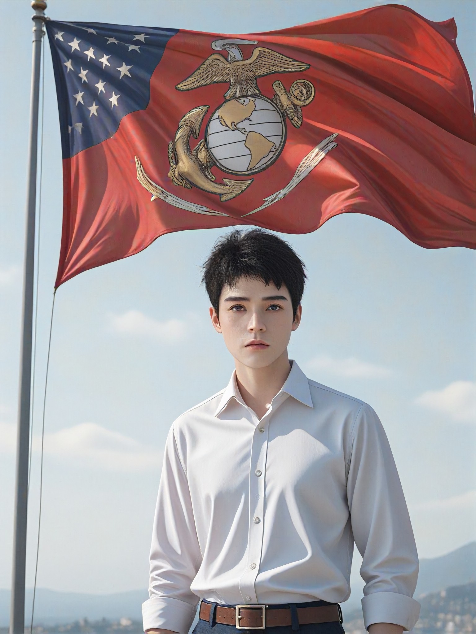 Beyaz bir gömlek giyen bir kişi ve arka planda devasa bir deniz piyade birliği bayrağı ile profesyonel ve etkileyici bir görüntü oluşturun. Bu stil dönüştürücüsü, herhangi bir dijital fotoğrafta yetki ve gurur hissi eklemek için mükem