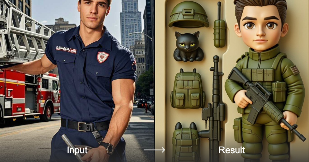 Oyun varlıkları, kör kutular veya sanat projeleri için mükemmel 3D askeri temalı chibi figürlerini Master tasarımımız ve şekerleme tarzı dönüştürücümüzle oluşturun.