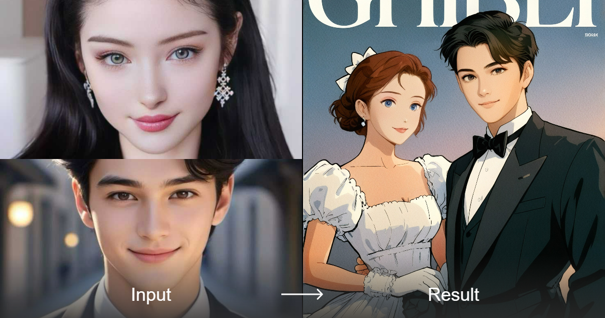 Transform your couple photos into enchanting digital paintings inspired by Studio Ghibli's iconic world, featuring Hayao Miyazaki's unique artistic style.