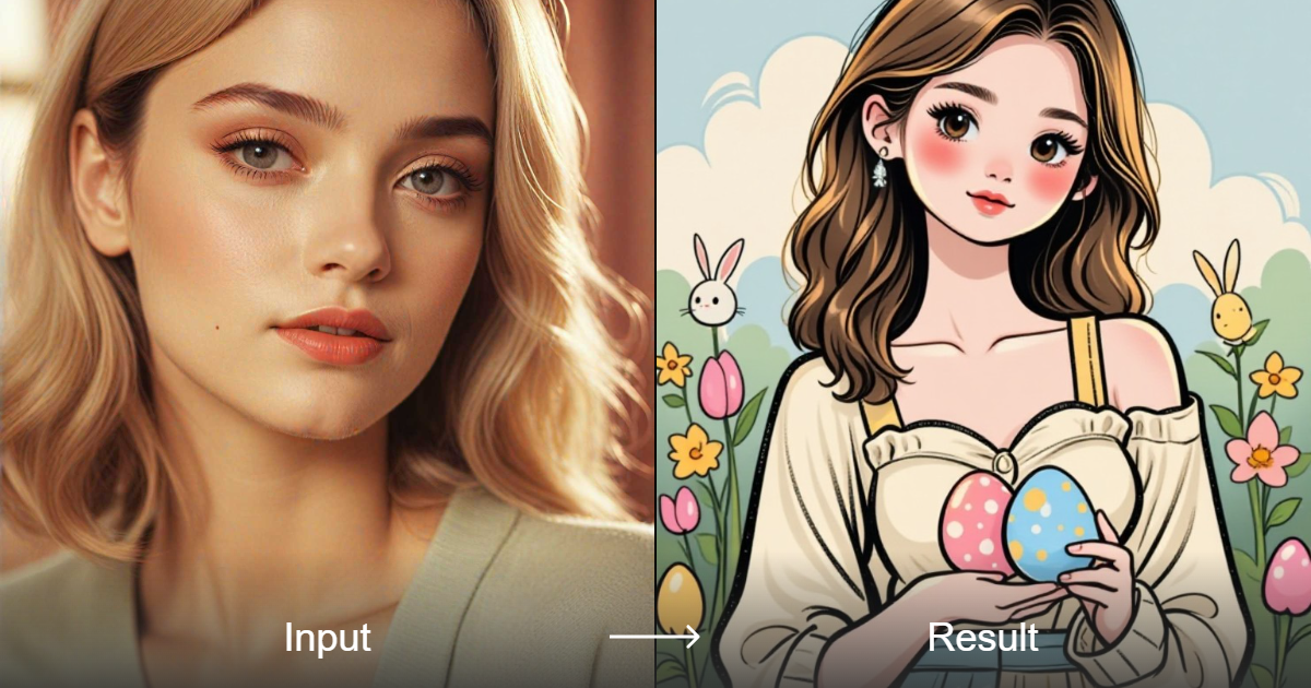 Transform your photos into adorable, hand-drawn, cartoonish, chibi-style Easter art with simple lines and a cute touch.