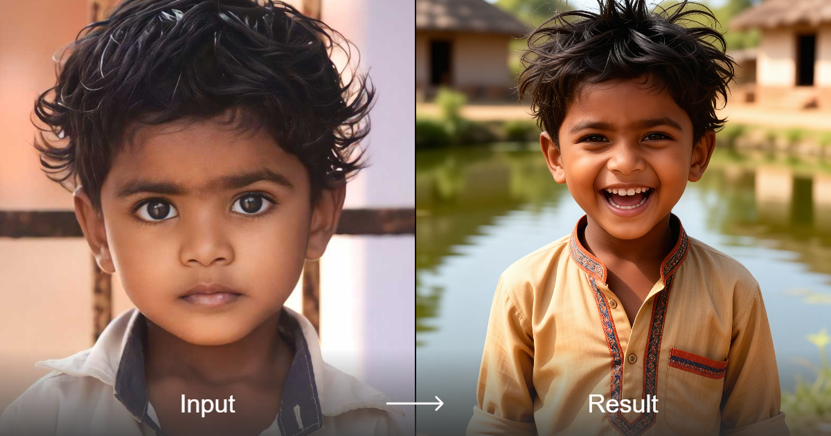 Transform your photos into a lively, cartoon-style portrait of a laughing Indian boy with cultural charm. Create unique AI art effortlessly.