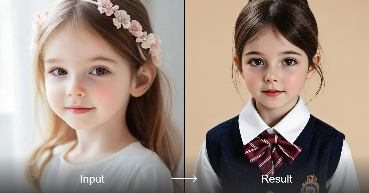 将您孩子的证件照转换成迷人的3D卡通形象,描绘一个扎蝴蝶结的小女孩,展现真实与创意的完美结合。