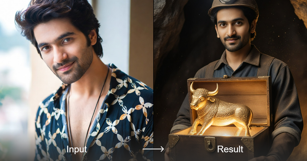 Create stunning AI-generated images of a heroic Indian miner with a glowing golden bull statue using our Gold Miner filter. Perfect for character art, photo effects, and creative storytelling.