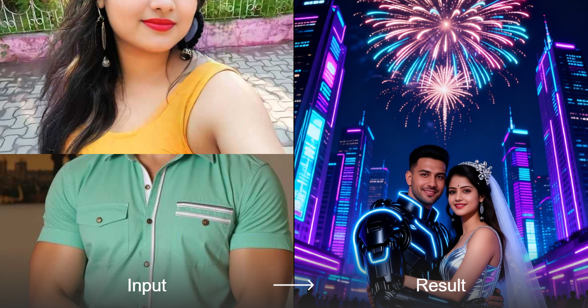 Transform your wedding photos into stunning Cyberpunk-themed scenes with this AI filter. Generate realistic, cartoon, and CG-style images featuring couples in a futuristic cityscape.
