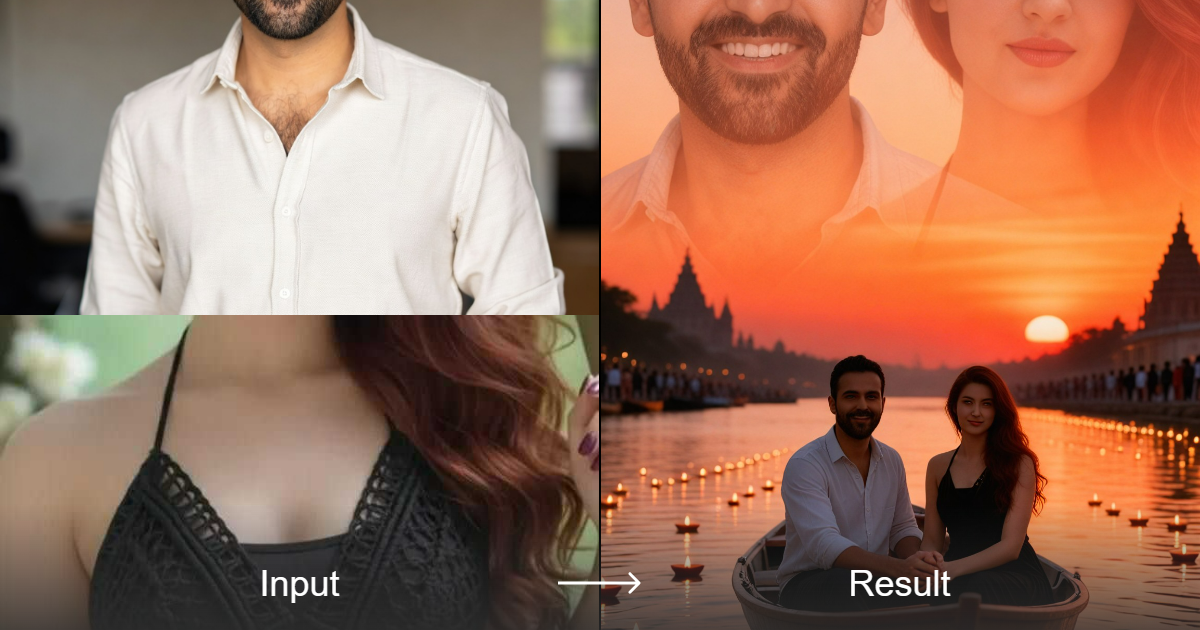 Transform your images into stunning Ganges Lantern Night double exposure art with this AI filter. Create romantic, culturally rich visuals featuring dual-layered scenes and cinematic lighting effects.