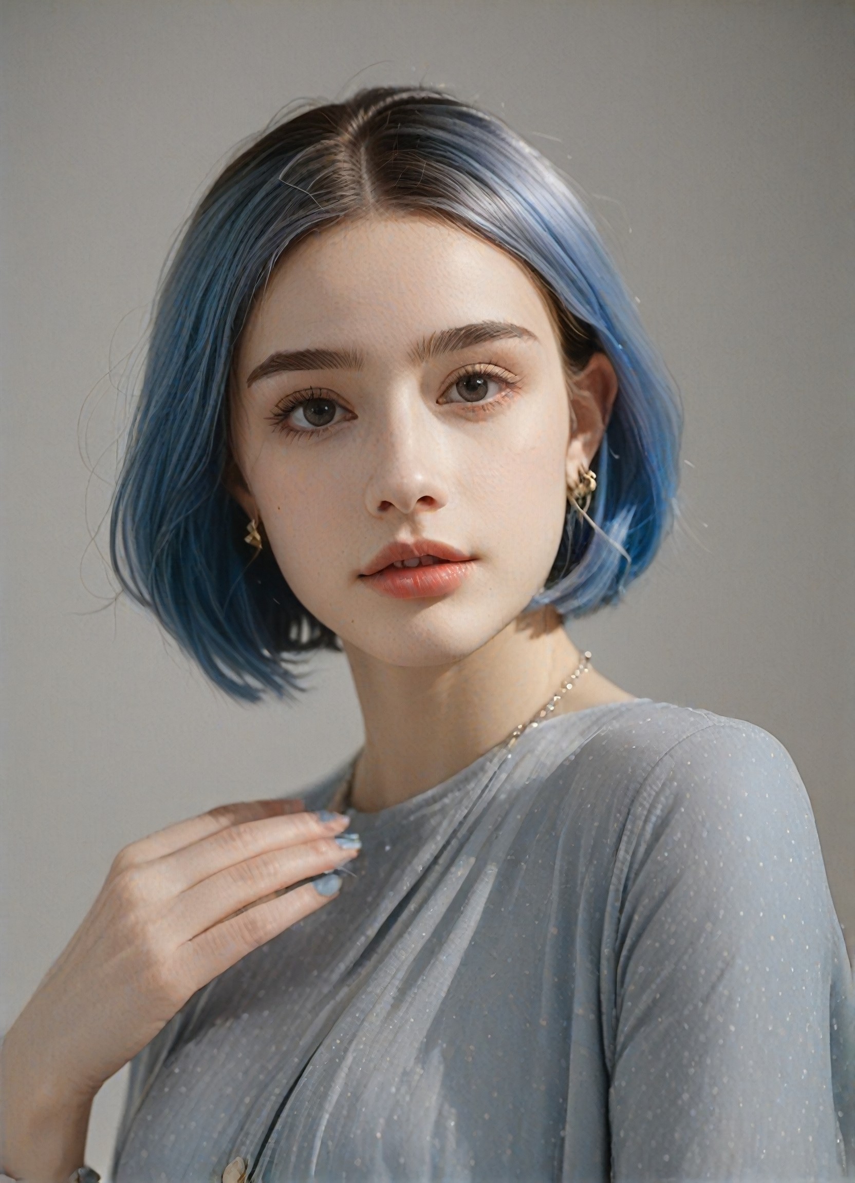 虚拟银蓝色头发试戴工具 - 真实感、摄影、肖像、单人、独照、上半身、发型和颜色匹配 | a1.art