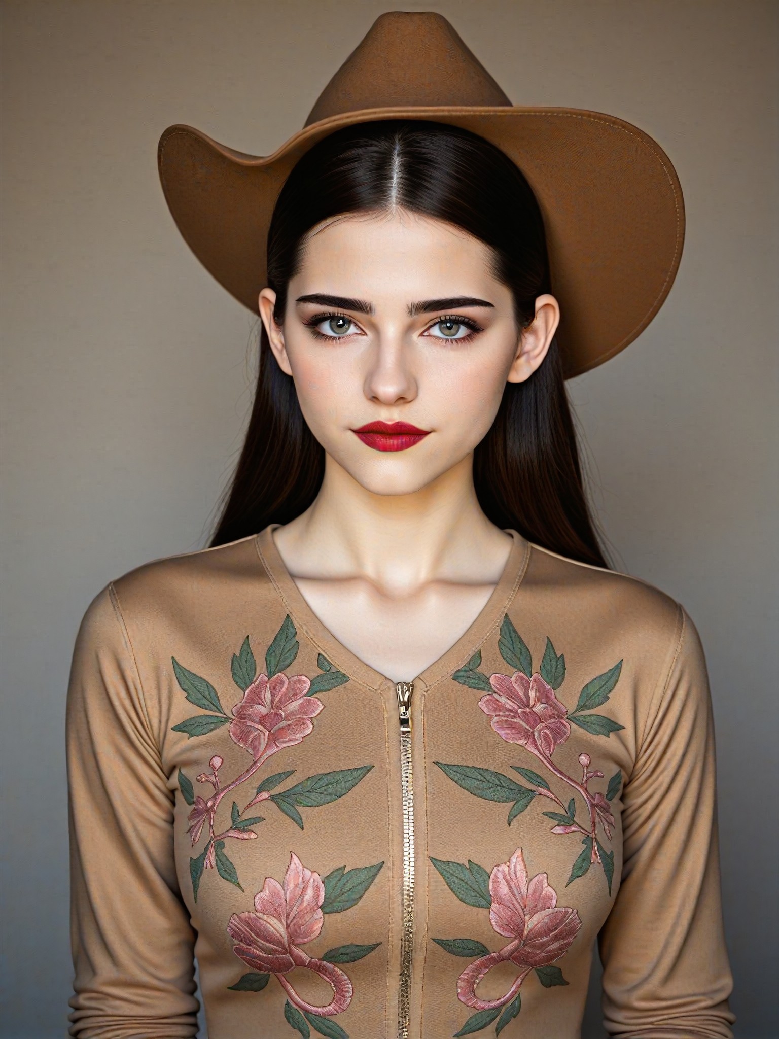 通过这个虚拟试戴图像体验牧场主帽子的外观。该图像包含5个风格组件,搭配与帽子风格相匹配的上衣。获取由a1.art生成的特色、大师或现实主义图像。