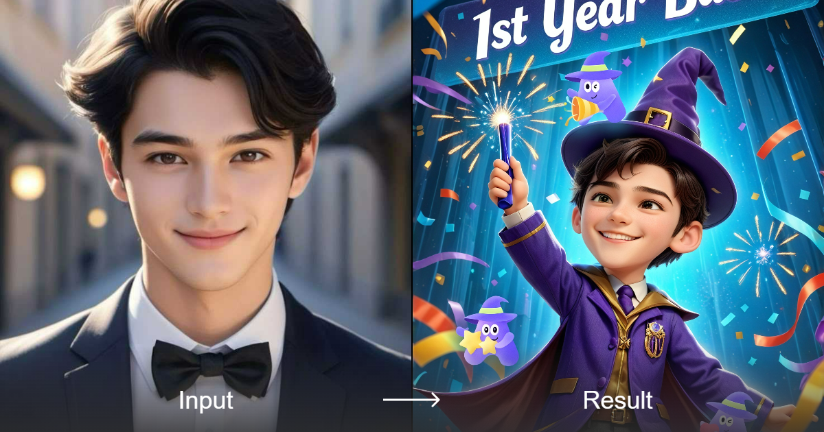 将您的创意转化为可爱的3D角色动画,使用我们的周年庆典风格转换器,非常适合节日和庆祝设计!